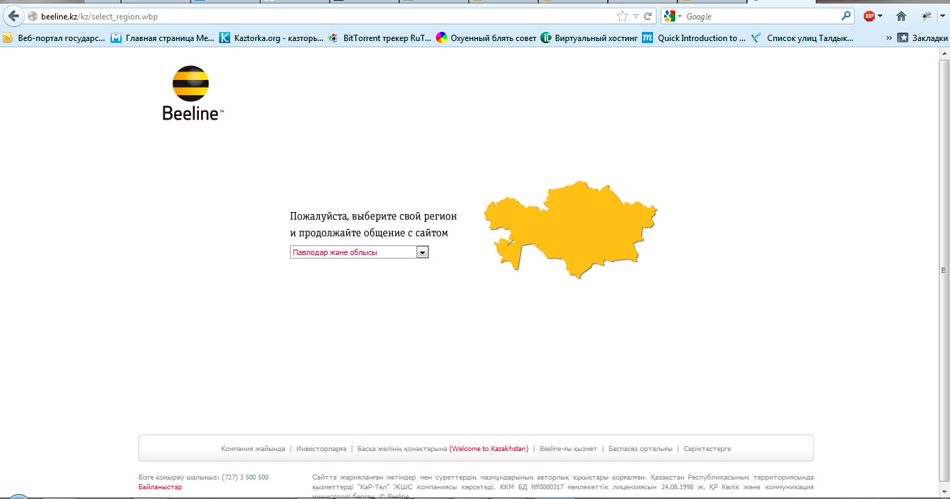 Господа, убейте ваших программистов, которые сайт вам делали. При заходе по адресу beeline.kz он определяет моё расположение, хорошо. Но так пусть сразу на сайт и переадресовывает, а не висит на странице, с выбранным пунктом "Павлодар и область" и всё, пиндец, никуда не ходит. Потому, что фактически при повторном выборе этого пункта он не реагирует (потому что событие не создается). Это раз, а два, на этой главной страничке то сделаете еще пунктики по переключению языков, а то вот так вот человек зашел, никуда зайти не может, и еще по умолчанию казахский язык без вариантов