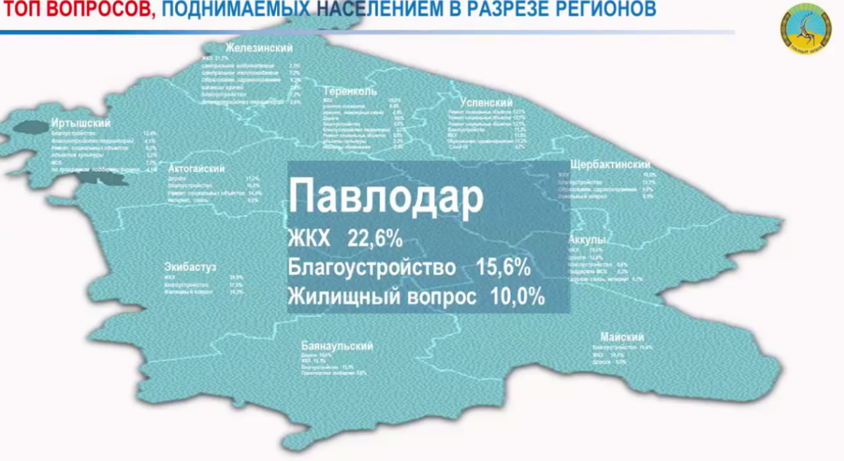 Также в аппарате акима выделили наиболее часто поднимаемые вопросы в разрезе регионов. Павлодарцев в первую очередь волнуют сфера ЖКХ, благоустройство и жилищный вопрос. Жителей Актогайского, Павлодарского и Баянаульского районов заботят некачественные дороги. Волнует сельчан первых двух названных районов и плохой интернет. Население Щербактинского района интересуется вопросами землепользования. Почти на нет сошли вопросы от сельчан, касающиеся водообеспечения и ветеринарной безопасности.